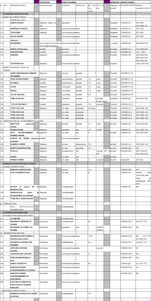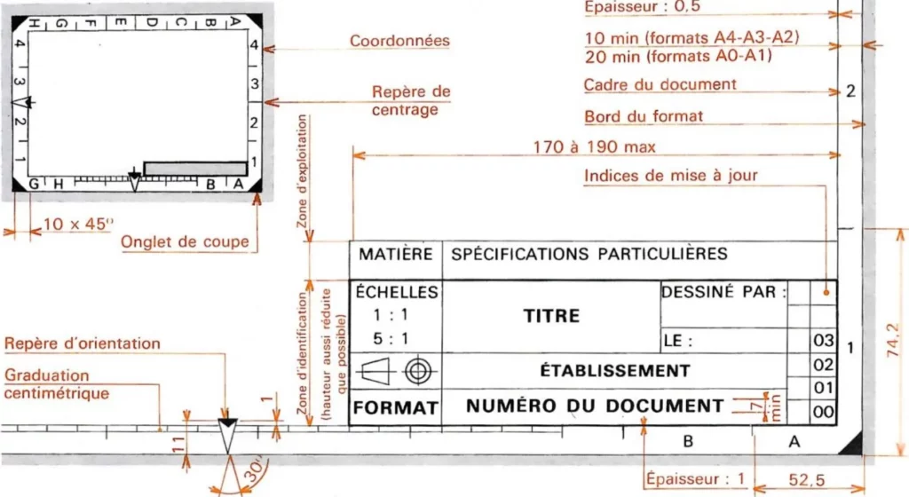 Le cartouche reçoit les inscriptions nécessaires et suffisantes pour l’identification et l’exploitation du document. Ci-dessous un extrait de la norme pour le récapitulatif du cartouche.