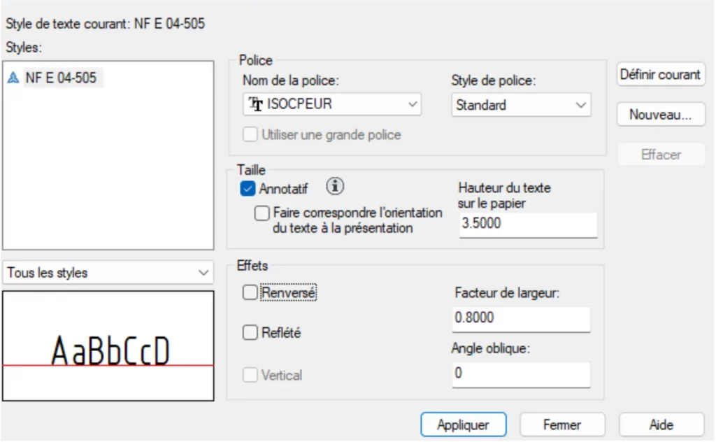 Pour les logiciels de dessin actuels, la police présentée par cette norme est « ISOCPEUR » dont ci-dessous une capture de la configuration possible du style de texte, où h correspond à la Hauteur du texte :