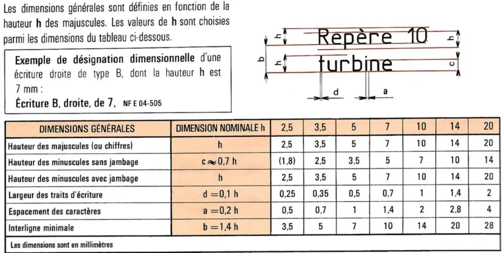 Ci-dessous l’extrait de la norme faisant le récapitulatif des dimensions des écritures.